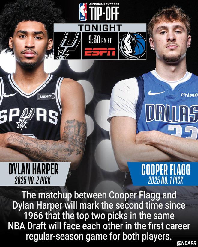 据NBA官方统计,弗拉格和哈珀今天在揭幕战的对决,是自1966年以来,第二次出现同一届NBA选秀的前两名选秀球员在各自职业生涯的第一场常规赛中相遇。